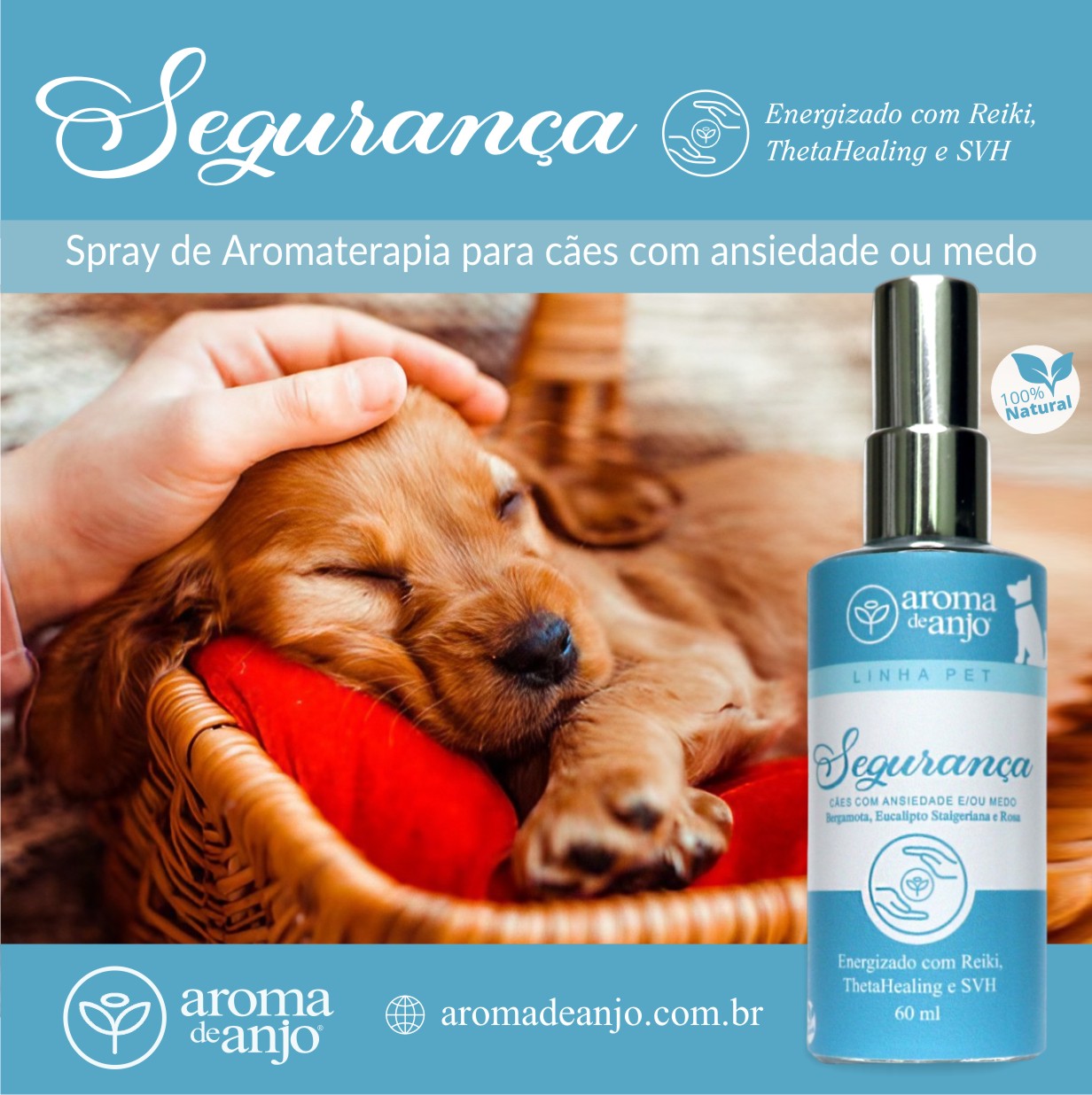 Em cada borrifada do spray de aromaterapia para cães “Segurança“, da linha de Aromaterapia PET Aroma de Anjo, você oferece um abraço carinhoso para seu amigo peludo. Formulado para cães que enfrentam medos e ansiedades, esse spray traz alívio durante eventos com fogos de artifício, distúrbios ansiosos, como a lambedura compulsiva, e outras situações estressantes.